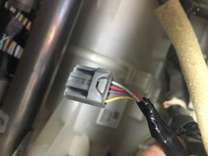 ・5ピンコネクタの使われていない端子「4番端子」に増設用の配線を接続し、コネクタをもとに戻します。上のコネクターの画像でも黄色と紫の配線の間が空いているのがわかると思います。